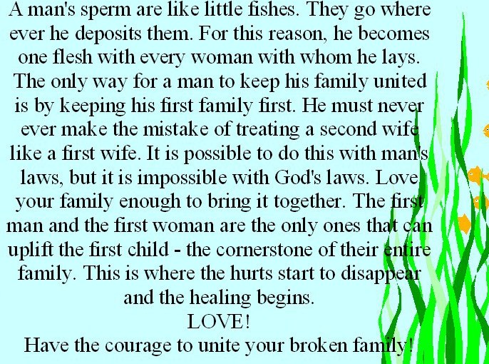 A man’s sperm are like little fishes. They go where ever he deposits them. For this reason, he becomes one flesh with every woman with whom he lays. The only way for a man to keep his family united is by keeping his first family first. He must never ever make the mistake of treating a second wife like a first wife. It is possible to do this with man’s laws, but impossible with God’s laws. Love your family enough to bring it together. The first man and the first woman are the only ones that can uplift the first child – the cornerstone of their entire family. This is where the hurts start to disappear and the healing begins. LOVE! Have the courage to unite your broken family. Become a gatherer and not a scatterer.